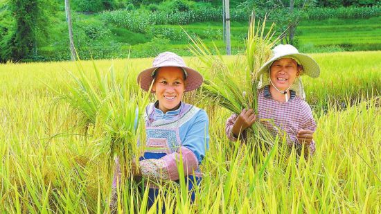师宗县五龙乡牛尾村群众收割稻谷。 本报通讯员 贾严 摄