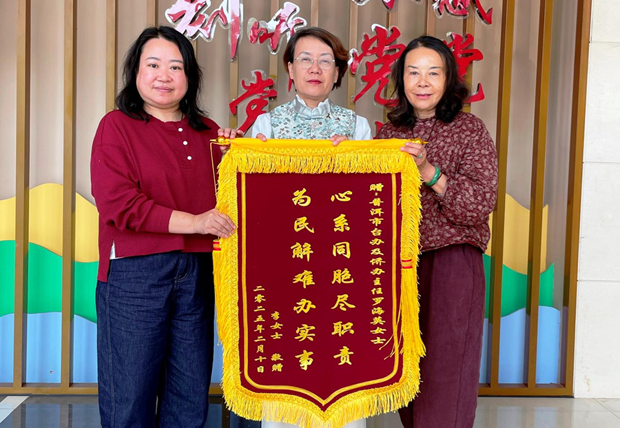 2月18日,台胞李艳梅女士将一面“为民解难办实事 心系同胞尽责任”的锦旗及一封感谢信送至普洱市委台办,以此感谢普洱市台办积极帮助李女士解决台胞证和户籍办理等困难问题。