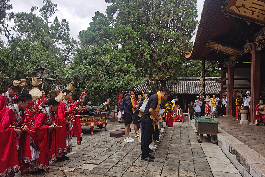 采访团第三站来到了“千年临安古城”建水县,在朝阳楼,通过对城门楼的建筑工艺、各类展陈、珍贵的图片资料、悬挂的古牌匾等详细了解千年建水古城的建城史、发展史及建水各族群众交往交流交融的团结奋斗史,在与众多文物的对话中感受到了千年古城承载的深厚历史人文内涵和古城保持的生机活力。在文庙,全流程亲身体验了佩戴绶带、盥洗、行正冠礼、迎圣进殿及初献、亚献、终献“三献礼”仪式,让大家在与文庙深厚的历史文化碰撞中接受了一场深刻的思想洗礼和中华优秀传统文化的熏陶,加深了大家对中华文化的认知和认同。