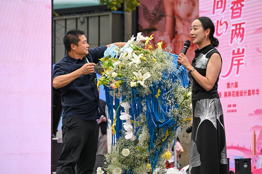 昆台两地知名花艺师现场联合创作花植(图片来源:中新社)