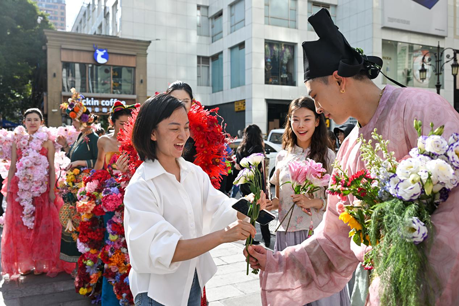 工作人员为市民赠送鲜花(图片来源:中新社)