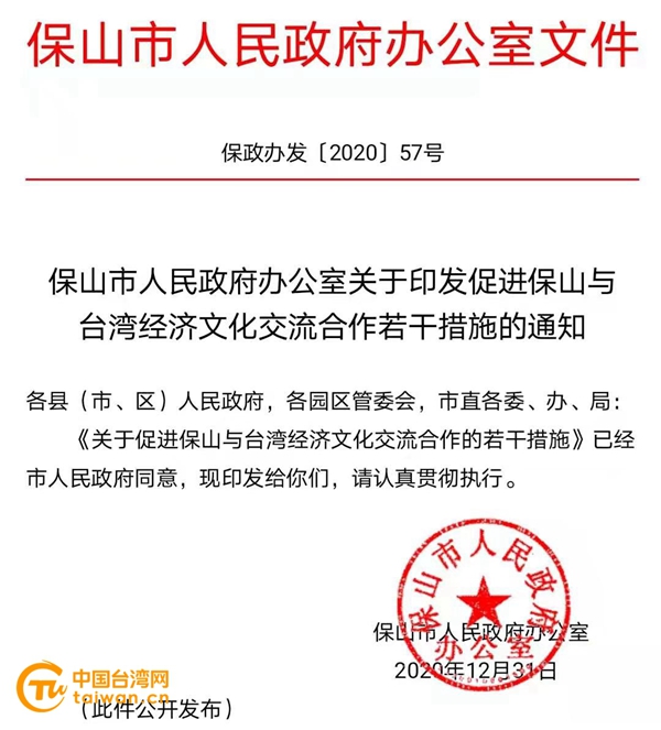 《保山市人民政府办公室关于印发促进保山与台湾经济文化交流合作若干措施的通知》。(图片来源:云南省保山市台办供图)